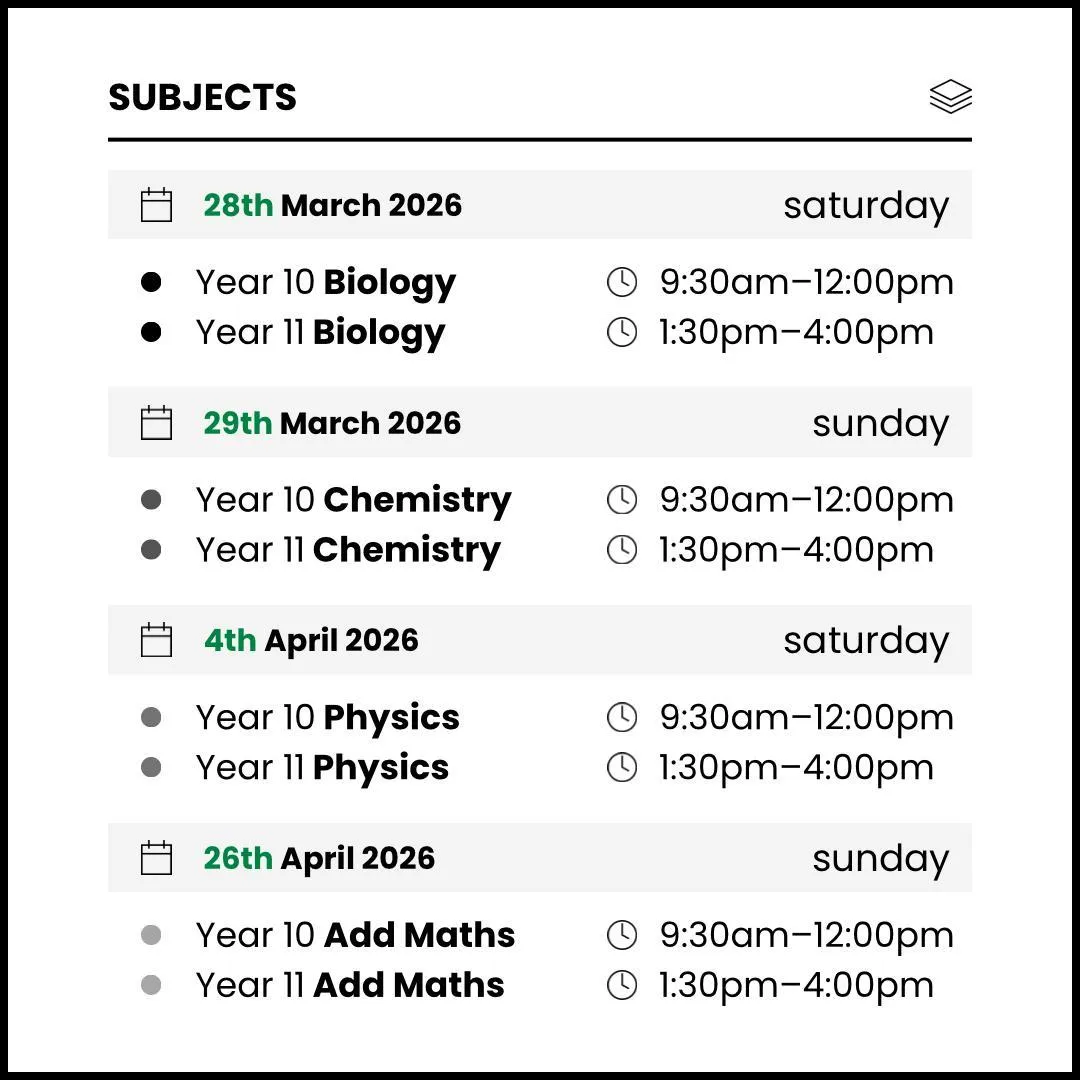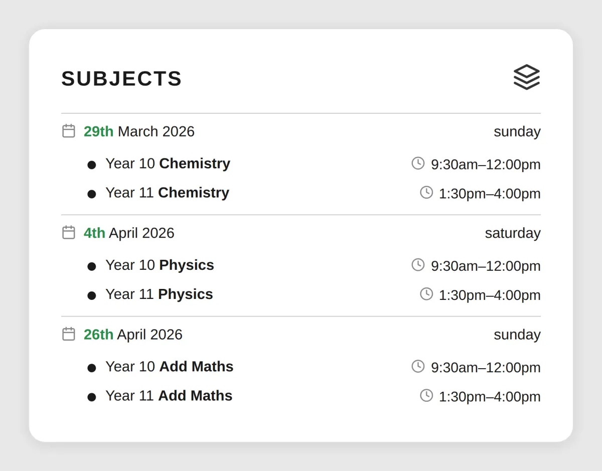 Each subject — Biology, Chemistry, and Physics — is conducted in 2.5-hour sessions per year level, designed to maximise focus, understanding, and retention